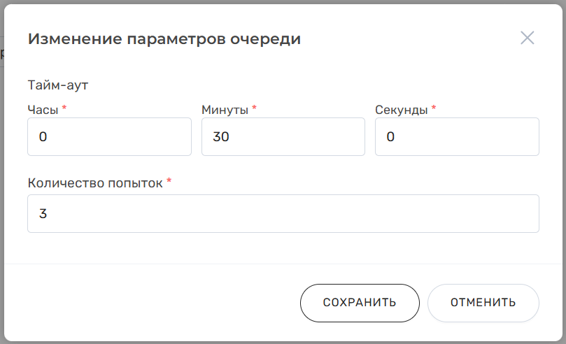 Для изменения параметров очереди нажмите на кнопку «Изменить параметры очереди» и установите нужные значения в открывшемся окне: