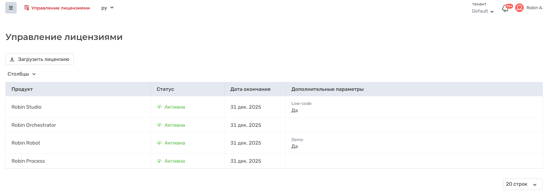 Таблица в модуле "Управление лицензиями" содержит список лицензий на продукты Robin. Информация о лицензиях взята из файла лицензии, загруженном на сервер системы.