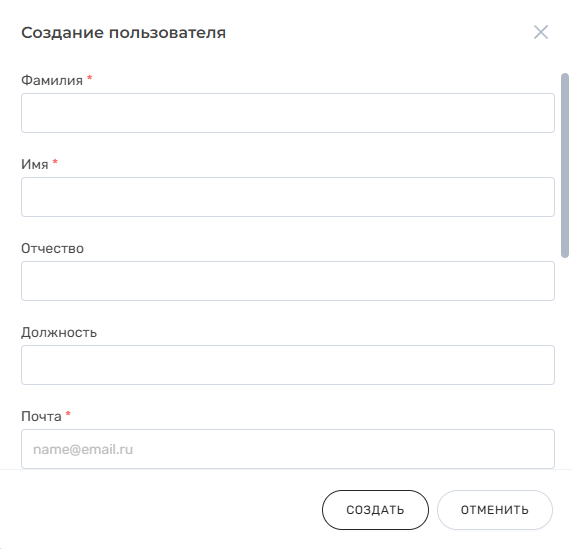 3. Нажать на кнопку «Создать» для подтверждения создания пользователя. Или нажать на кнопку «Отменить», если решили не создавать нового пользователя. Если все поля заполнены верно, окно будет закрыто, а новый пользователь добавлен в систему.