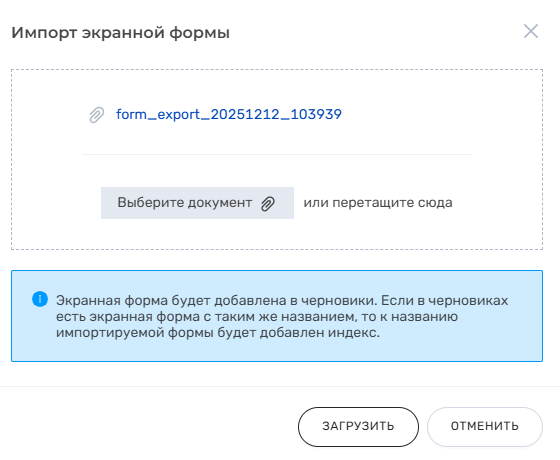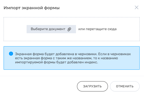 Кнопка "Импортировать экранную форму" | При нажатии откроется модальное окно "Импорт экранной формы", в которое пользователь может загрузить ранее экспортированную экранную форму (подробнее об экспорте см. в Экспорт экранной формы). Импортируемая экранная форма будет добавлена в черновики пользователя раздела "Редактор экранных форм" О том, как работает импорт см. в Импорт экранной формы. |