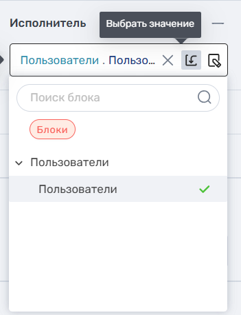 Выбор действия | В поле выбираются действия из выпадающего списка для работы с различными типами значений.