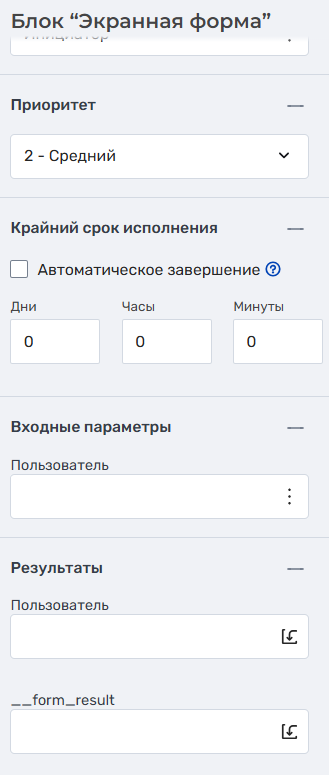 - Входные параметры (заполняются дизайнером процесса после выбора процесса)