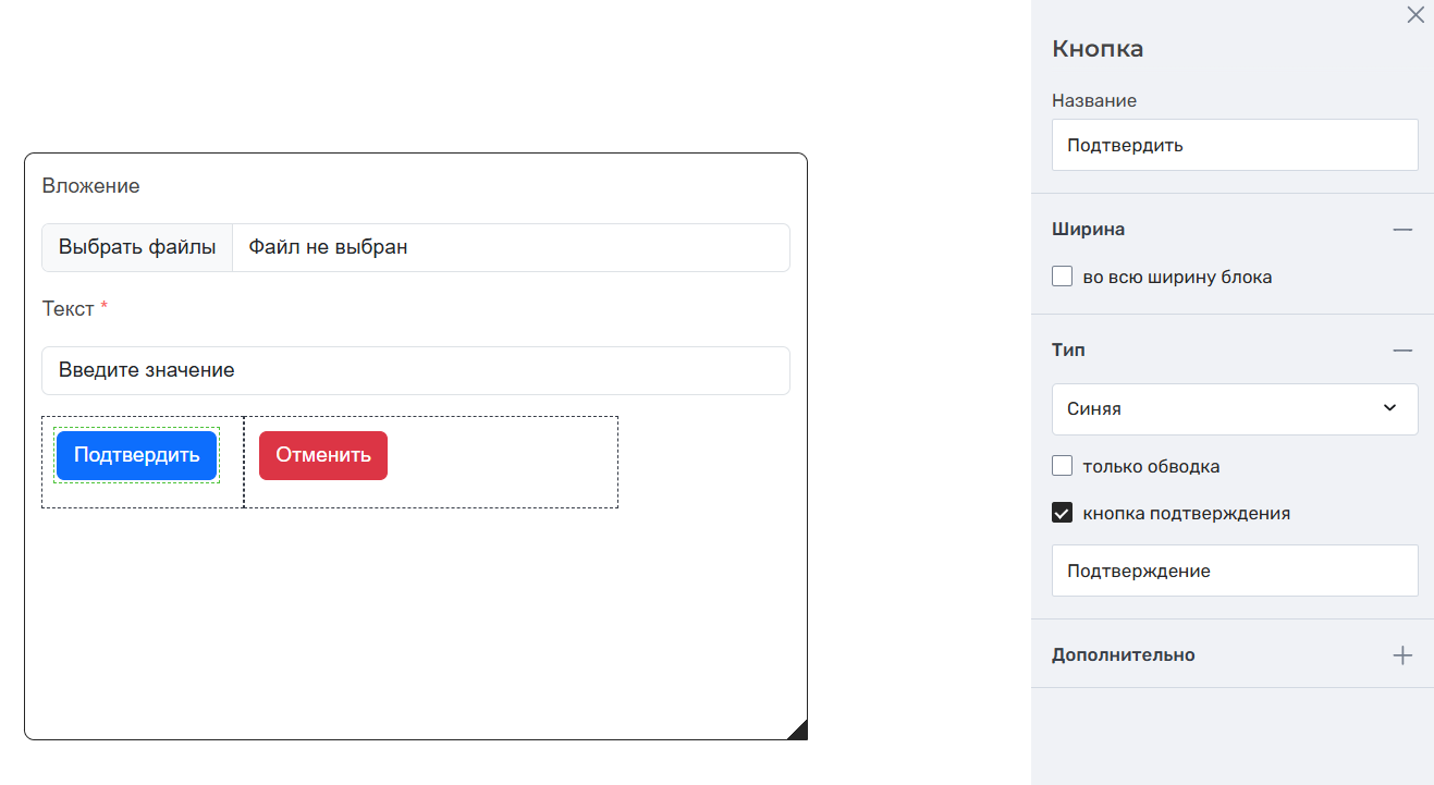 Входные параметры | Поля и тип входных параметров зависят от выбранного действия. Более подробно про входные параметры у каждого действия см. на странице Описание действий в блоке "Обработка значений". При выполнении блока заполненные входные параметры будут использоваться для выполнения выбранного действия. | |