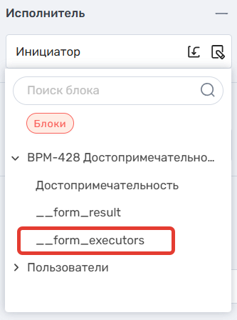 После запуска процесса данные инициатора в блоке «Старт» становятся результатом этого блока. В параметрах других блоков эти данные можно выбрать из выпадающего списка и передавать в другие блоки: