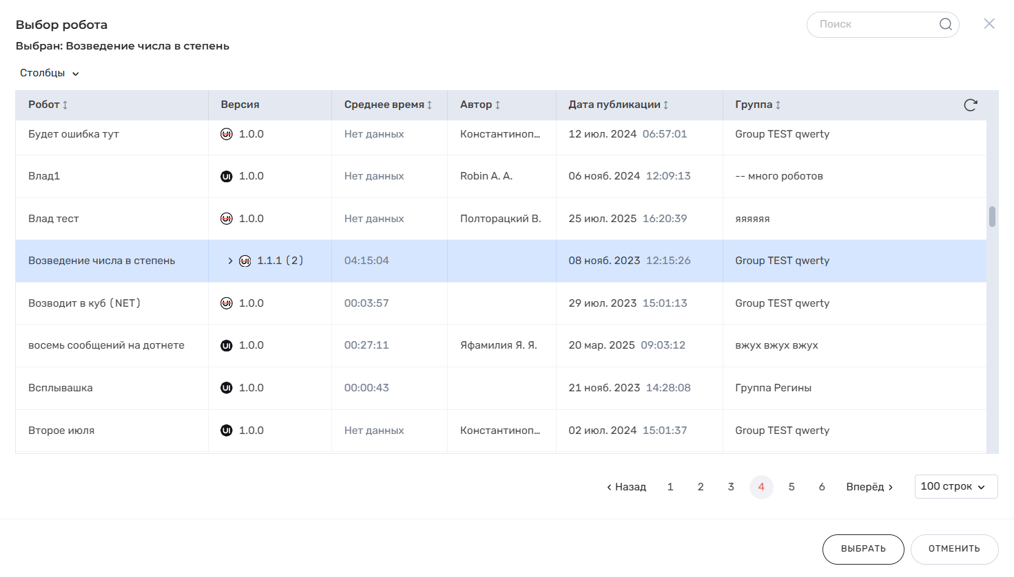 При нажатии на кнопку "Выбрать робота" появляется список готовых роботов, в котором необходимо выбрать тот, который будет выполнять задачу. Выбор робота осуществляется с помощью ЛКМ. В качестве примера выбран робот "Возведение числа в степень":