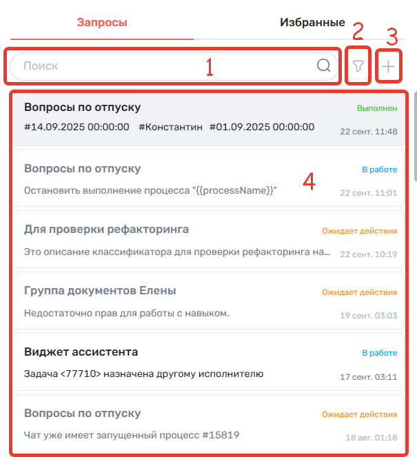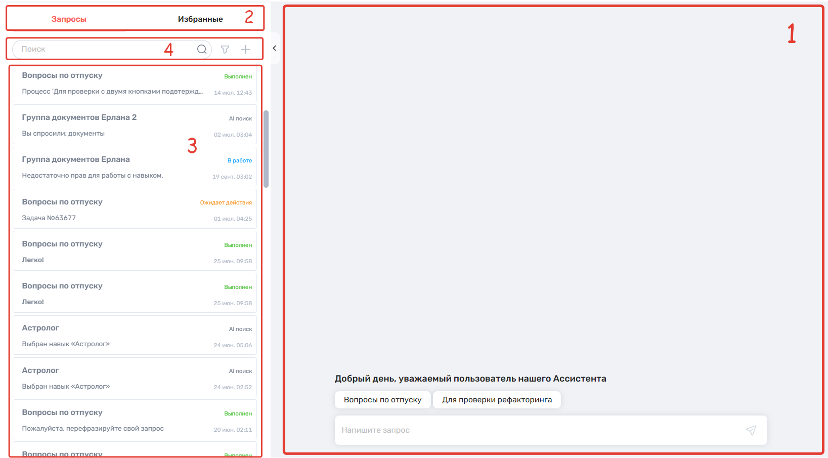 - Панель Ассистента – левая часть экрана, включает панель с фильтрами, поиском, вкладки "Запросы" и "Избранные" (2, 3, 4). Пользователь может просматривать историю своих запросов в чате, добавлять в избранное процесс/убирать из избранного процесс, запускать избранные процессы, а также отслеживать и фильтровать запросы по их статусам.