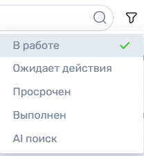 AI поиск | Используется, если выбран навык интеллектуального поиска или сценария LLM Такой чат не связан с процессами и задачами — в нём можно искать информацию по загруженным документам, задавать вопросы или вести диалог с языковой моделью. Если будет запущен процесс обратной связи в рамках такого чата, то статус изменится на "В работе". После выполнения процесса обратной связи запросу снова присвоится статус "AI поиск" |