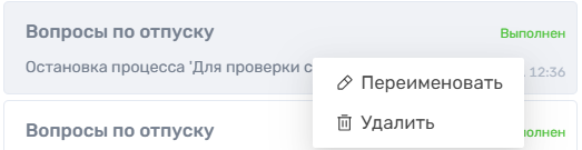 Кнопка "Запустить" | Располагается на каждом избранном процессе. При нажатии пользователь запускает новый экземпляр процесса. При этом создаётся новая запись запроса в чате Ассистента, название которого идентично названию запущенного процесса. Если у процесса есть запущенные экземпляры, кнопка окрашена в зеленый, если запущенных экземпляров нет – серый. |