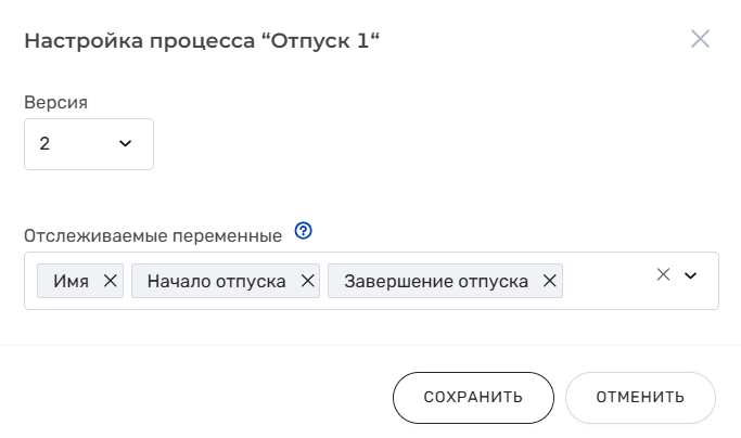 Например, был настроен и опубликован процесс с тремя переменными – "ФИО", "Дата начала" и "Дата окончания" и значениями по умолчанию для каждой переменной.