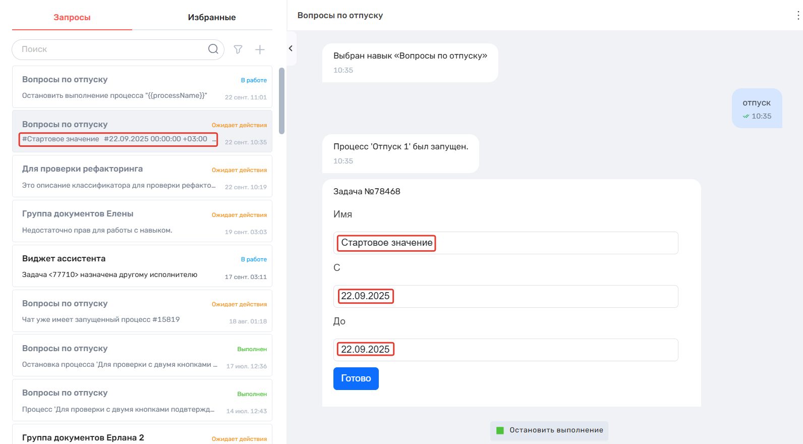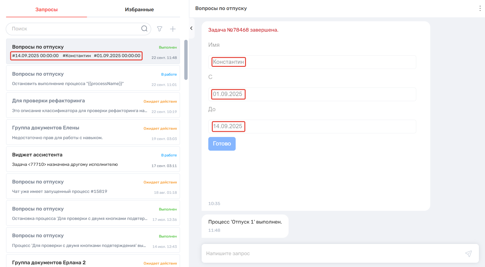 В записях запросов чата Ассистента могут отображаться значения переменных, используемых в процессе. Это позволяет отслеживать ключевые данные прямо в интерфейсе. Для того, чтобы значения отображались, Администратору процессов необходимо заранее настроить конкретный процесс и выбрать нужные переменные. Подробнее см. в Кнопка "Редактировать" у опубликованных процессов