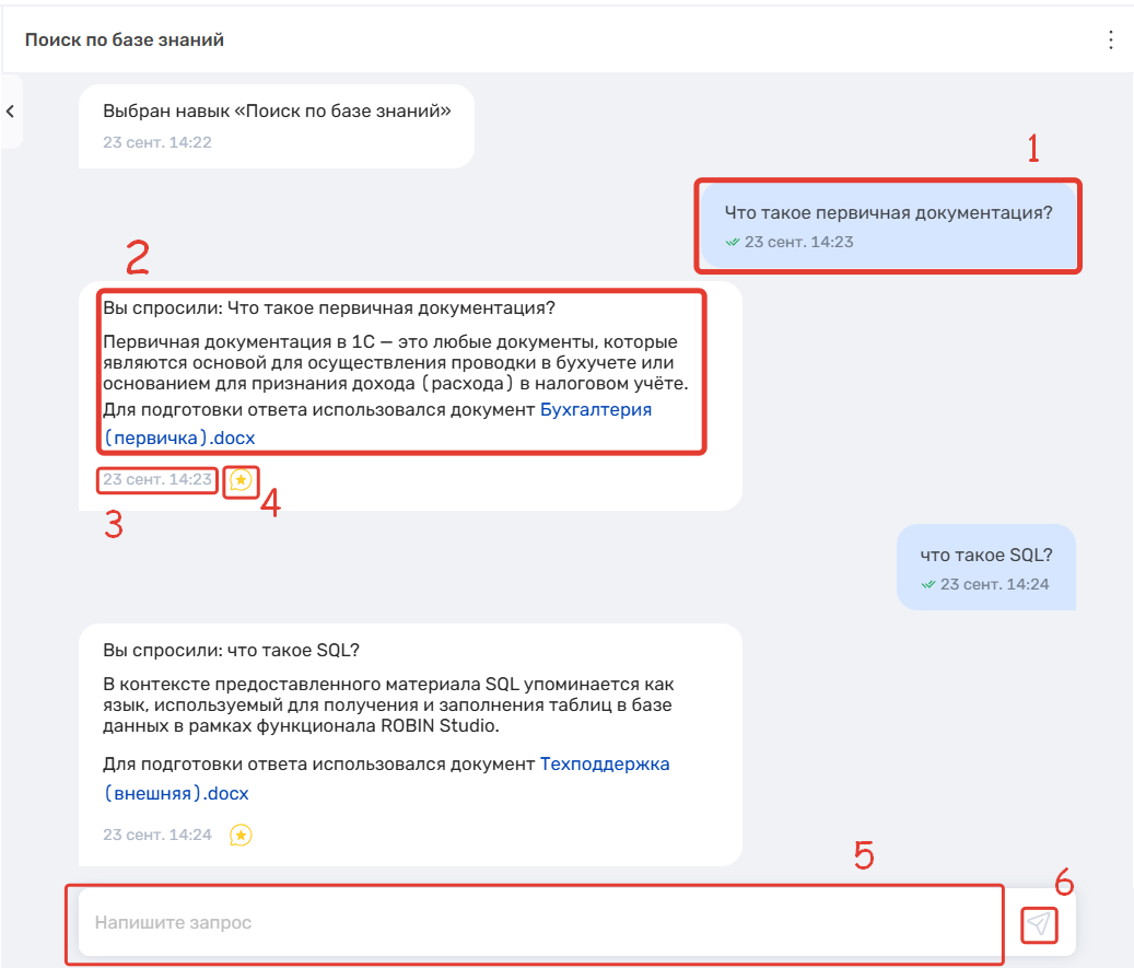 Пользователь в текстовом поле чата (5) пишет свой вопрос и отправляет нажав на кнопку "Отправить"(6).