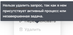 Если в запросе есть активный процесс или незавершённая задача, кнопка недоступна. При наведении выводится тултип: