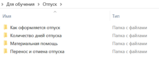2. Внутри папки создайте папки-рубрики верхнего уровня. Каждая папка соответствует одной тематике, по которой Ассистент должен уметь классифицировать запросы пользователей. Названия папок должны отражать смысл рубрики.