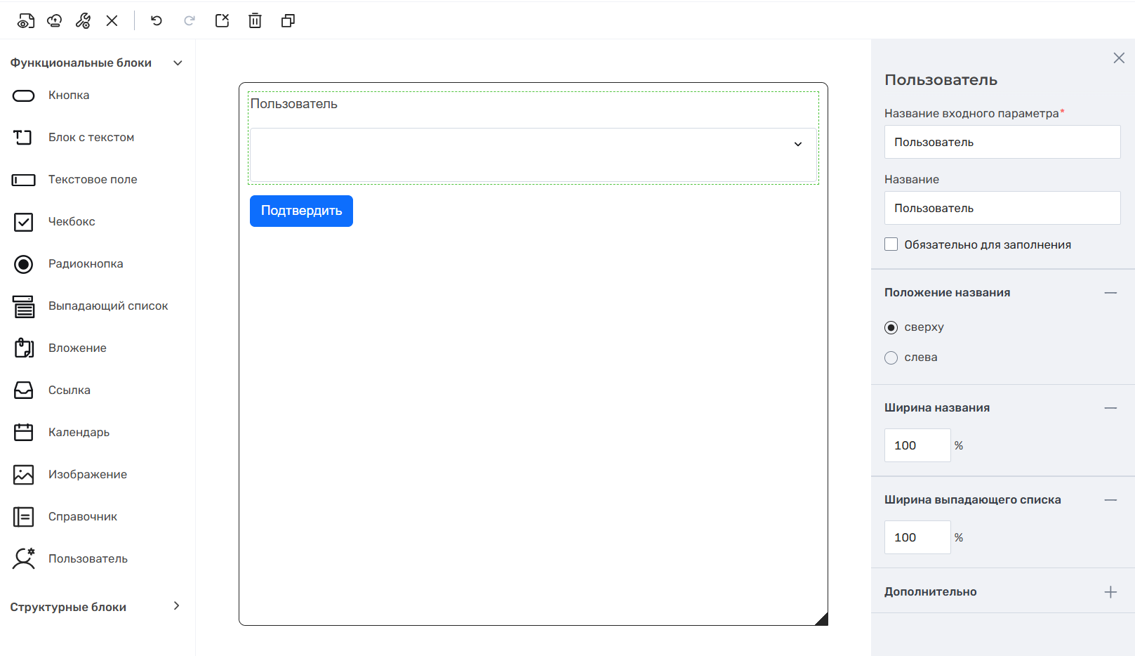 После настройки блока пользователь может приступить к размещению и настройке других элементов экранной формы.