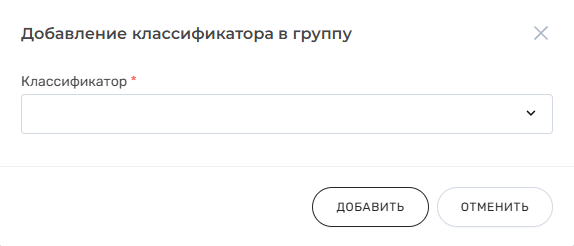 - В выпадающем списке в поле "Классификатор" выбрать тот, который необходимо добавить в группу. При этом в списке отображаются только те классификаторы, которые опубликованы в текущий тенант, но их нет в группах классификаторов.
