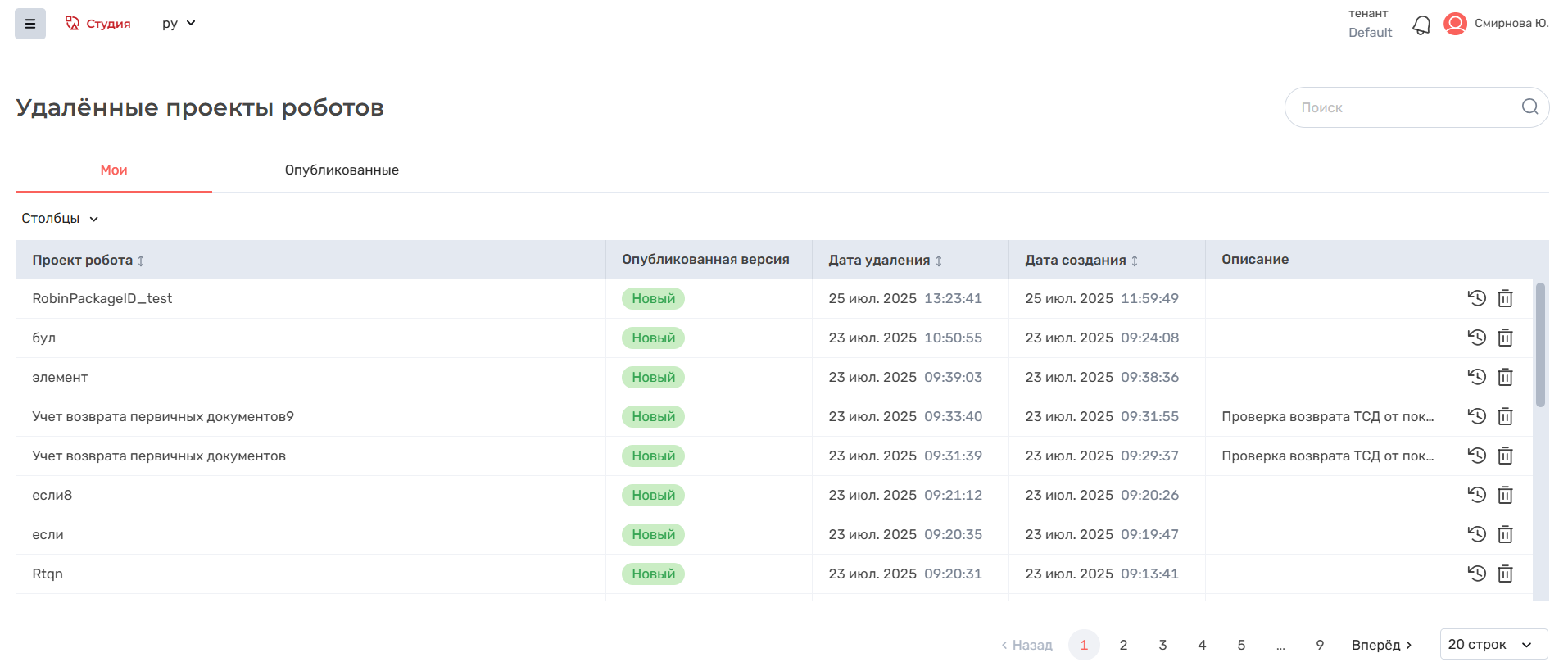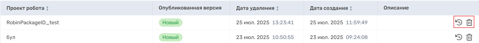 Раздел предназначен для управления удаленными проектами роботов. Здесь отображаются все удалённые проекты с возможностью их восстановления или безвозвратного удаления.