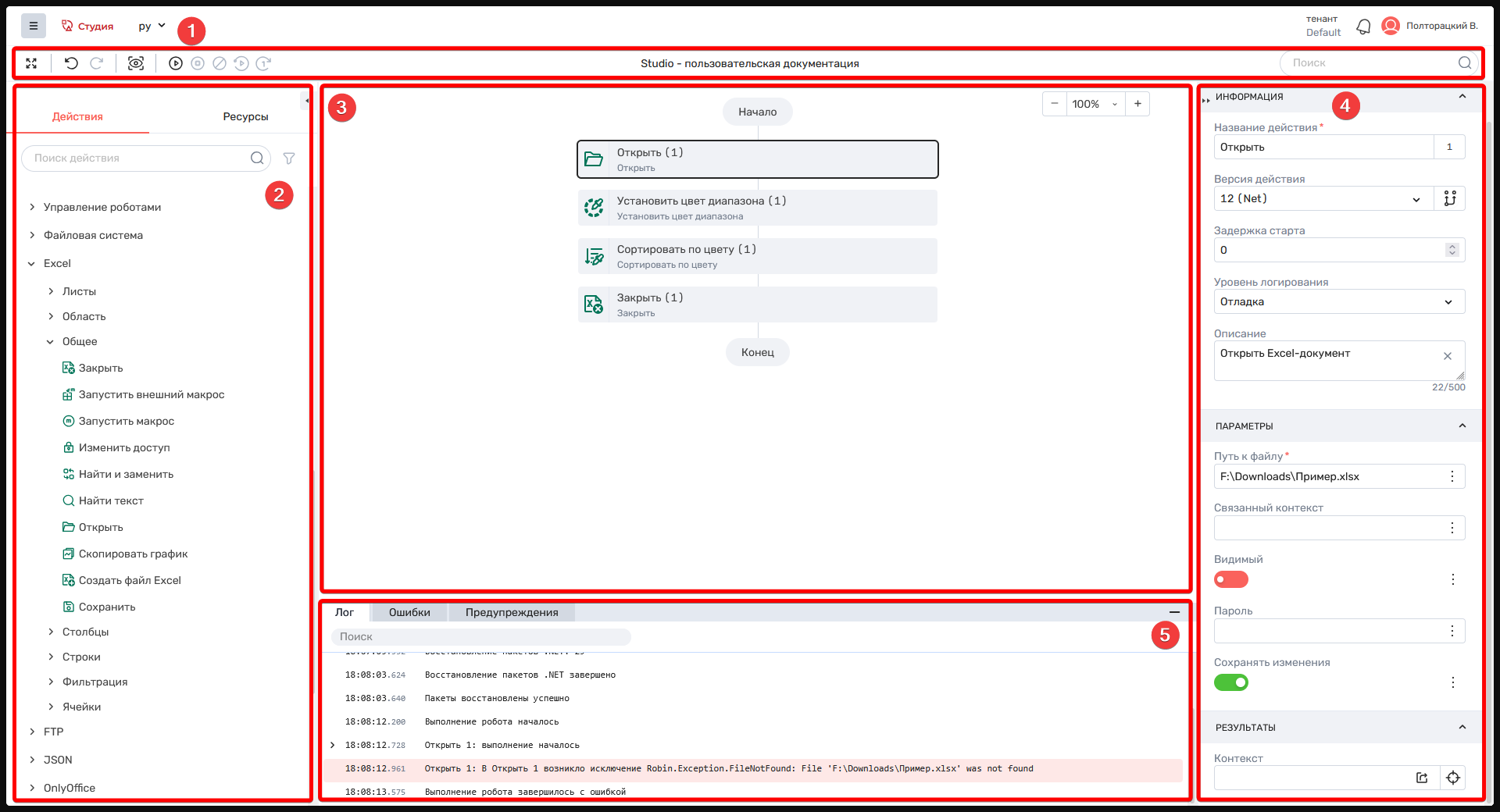- Левая панель – содержит список действий и список ресурсов, которые можно использоват в роботе.