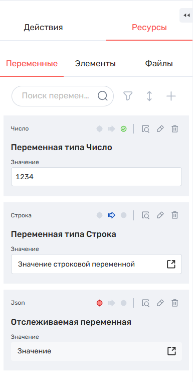 • Поле указания значения в карточке переменной – допустимо редактирование значений переменных, имеющих строковое или числовое значение или тип "Логический". Для остальных типов в поле представлено презентационное (краткое) значение, редактирование которого невозможно.