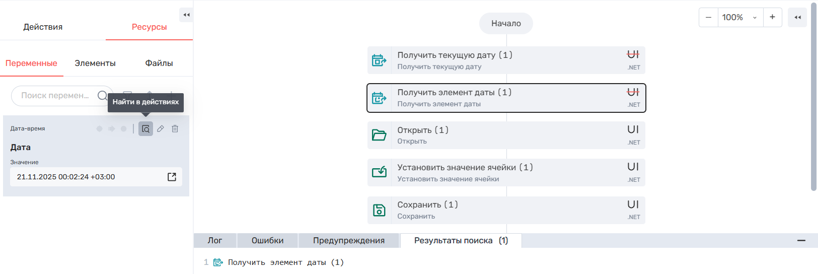 Найденные действия отобразятся во вкладке «Результаты поиска» в нижней панели. Вы можете перейти к действию на схеме, кликнув по его названию в списке.