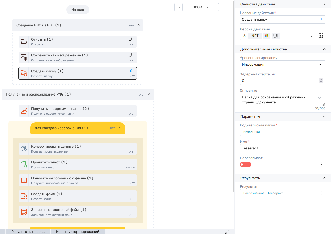 - Результаты – выходные значения, получаемые в результате работы действия. Подробнее читайте в разделе «Результаты».