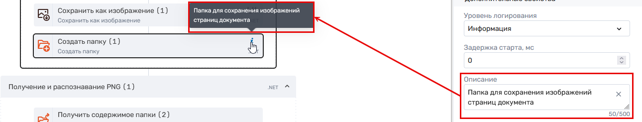 - Описание – описание действия, задаваемое разработчиком робота. Описание отображается по наведении на индикатор «i» в блоке действия. О других элементах блока действия читайте на странице «ROBIN Studio Web. Редактирование робота»
