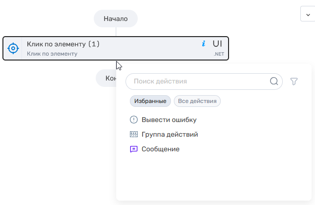 На левой панели находится список действий, которые можно использовать при создании схемы робота. Действия в списке можно отфильтровать по языку реализации, по поддерживаемой ОС и по требованию UI. Также необходимое действие можно найти по названию, используя поле «Поиск действия».