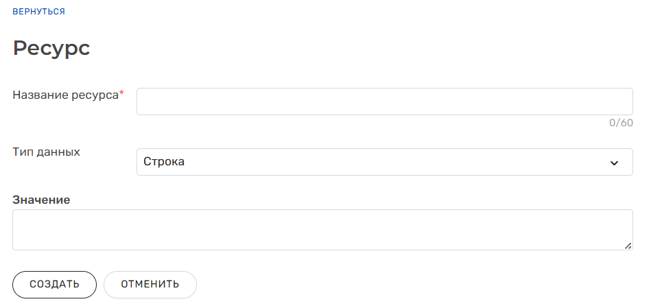 При нажатии на кнопку "Вернуться" карточка также закроется и отобразится раздел "Хранилище ресурсов", но новый ресурс не будет создан.