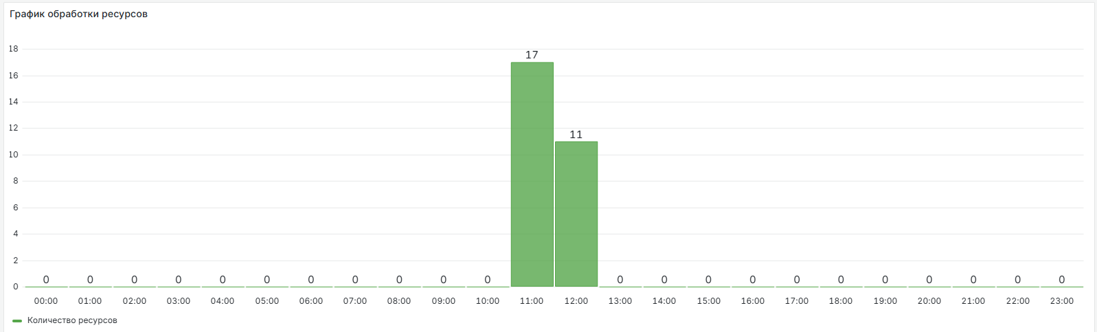 Диаграмма с графиком обработки ресурсов: отображает среднее количество обработанных ресурсов в разные часы дня. Учитываются ресурсы со статусами "Обработан" и "Ошибка", а также удаленные ресурсы.